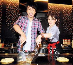 朱孝天(左)和前女友佐藤麻衣煎大坂烧,默契稍显不足。